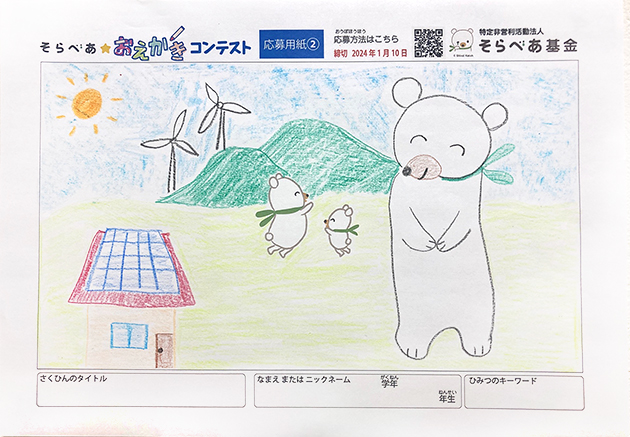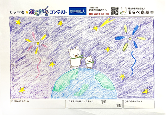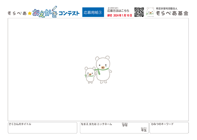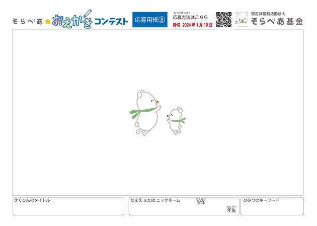 - 応募用紙をダウンロードして、そらとべあの周りに自由に絵を描き⾜してみよう。