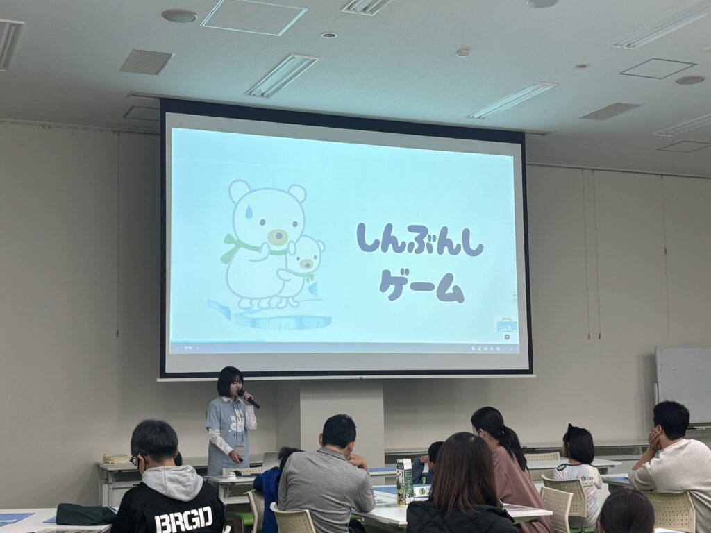 ゲームで動物たちの生態系への関心を高めた後、まゆさんから、これらの動物たちが直面している「地球温暖化」による深刻な危機について、具体的な事例を交えた説明が行われました。