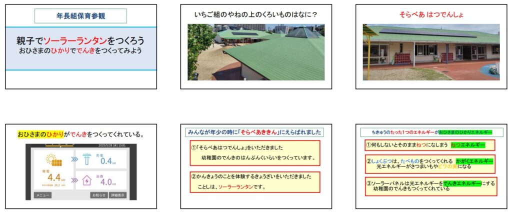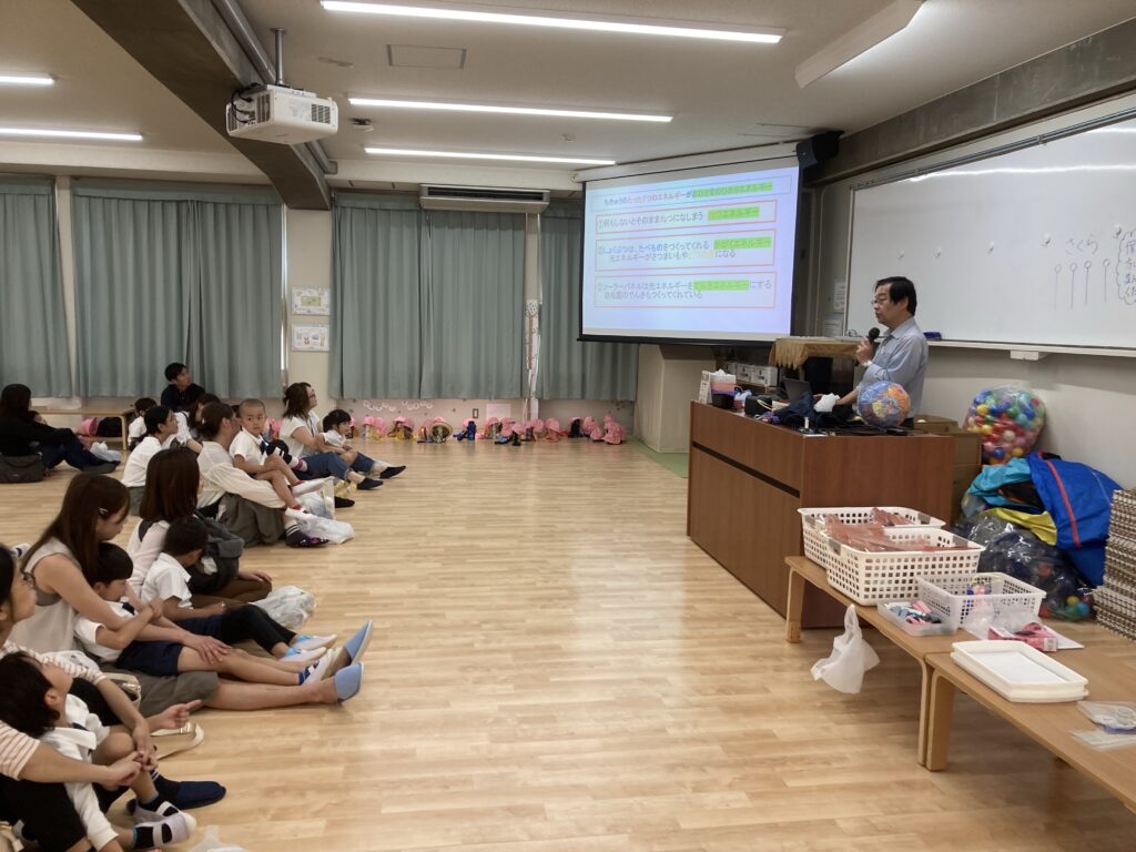 6月の保育参観日を利用して、園舎の屋根に設置されている太陽光発電設備「そらべあ発電所」や「エネルギー」に関するお話を、園長先生から年長組の子どもたちと保護者の皆さんにしました。