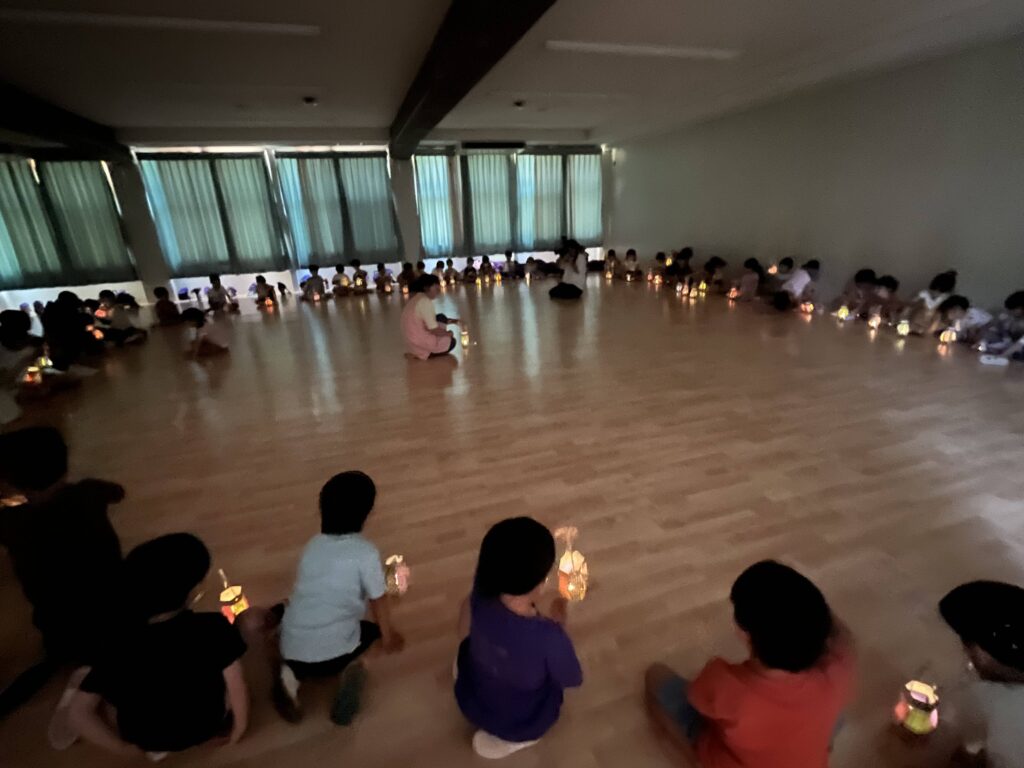 前回は日中の活動でライトの点灯が見えにくかったことから、今回は園内の部屋やホールなどを暗くして集まり、年長組全員で充電したソーラーちょうちんを一斉に点灯させることにしました。