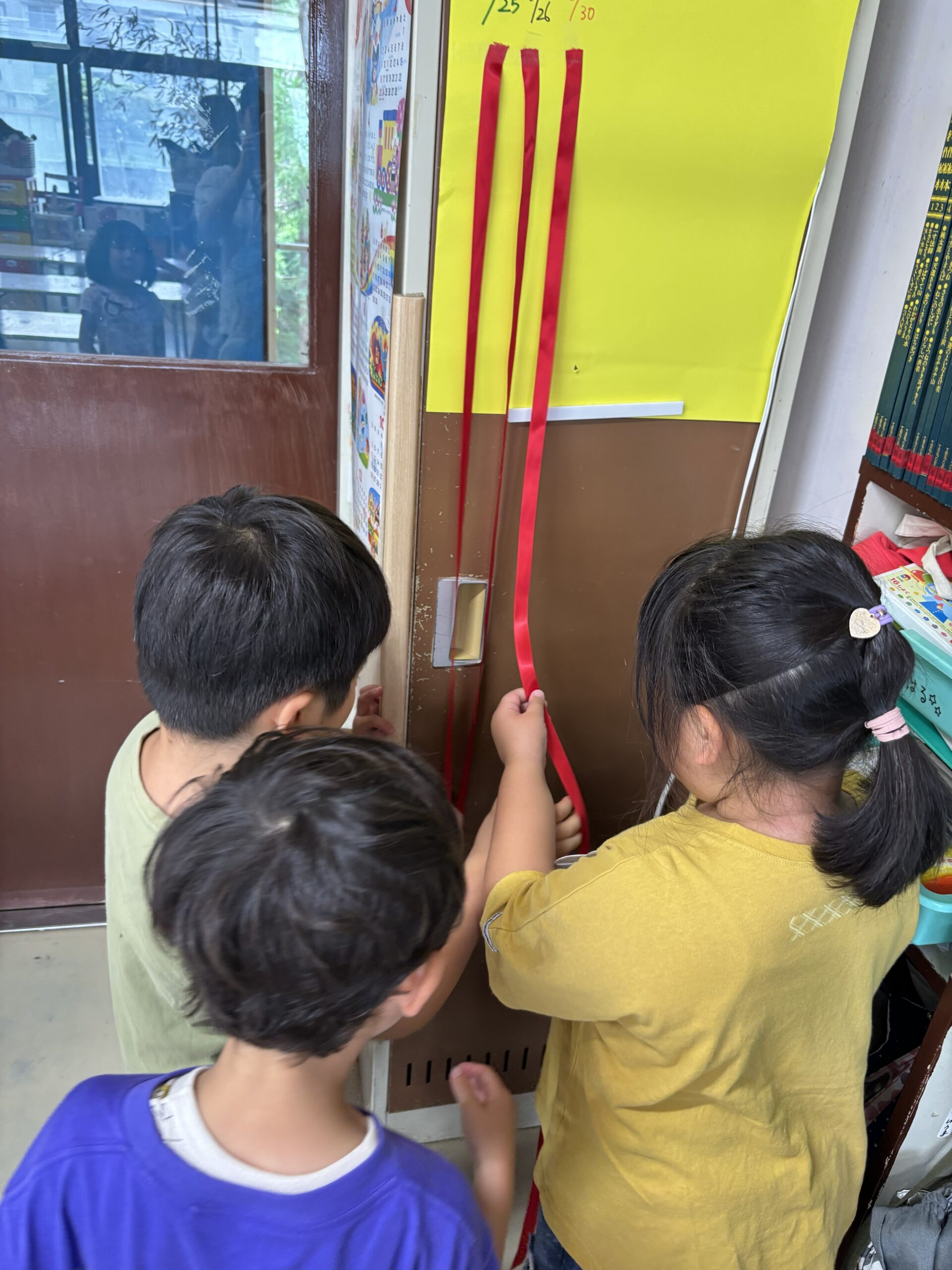 ゴーヤのツルが生長していく様子を、リボンや手作りの定規を使ってツルの長さを測りながら観察しました。花が咲くと、子どもたちはその数を毎日数え、次々に咲く花に喜びの声を上げていました。