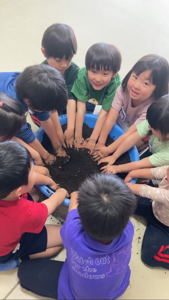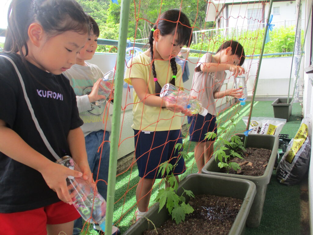 子どもたちは、シャベルや手を使って土の匂いや感触を楽しみながら、「よい土にな〜れ」と声をかけて、「土づくり」に取り組みました。また、一人ひとりがペットボトルで手作りしたジョウロを使って、2階のベランダに植えたゴーヤのプランターに、毎日水やりを行いました。