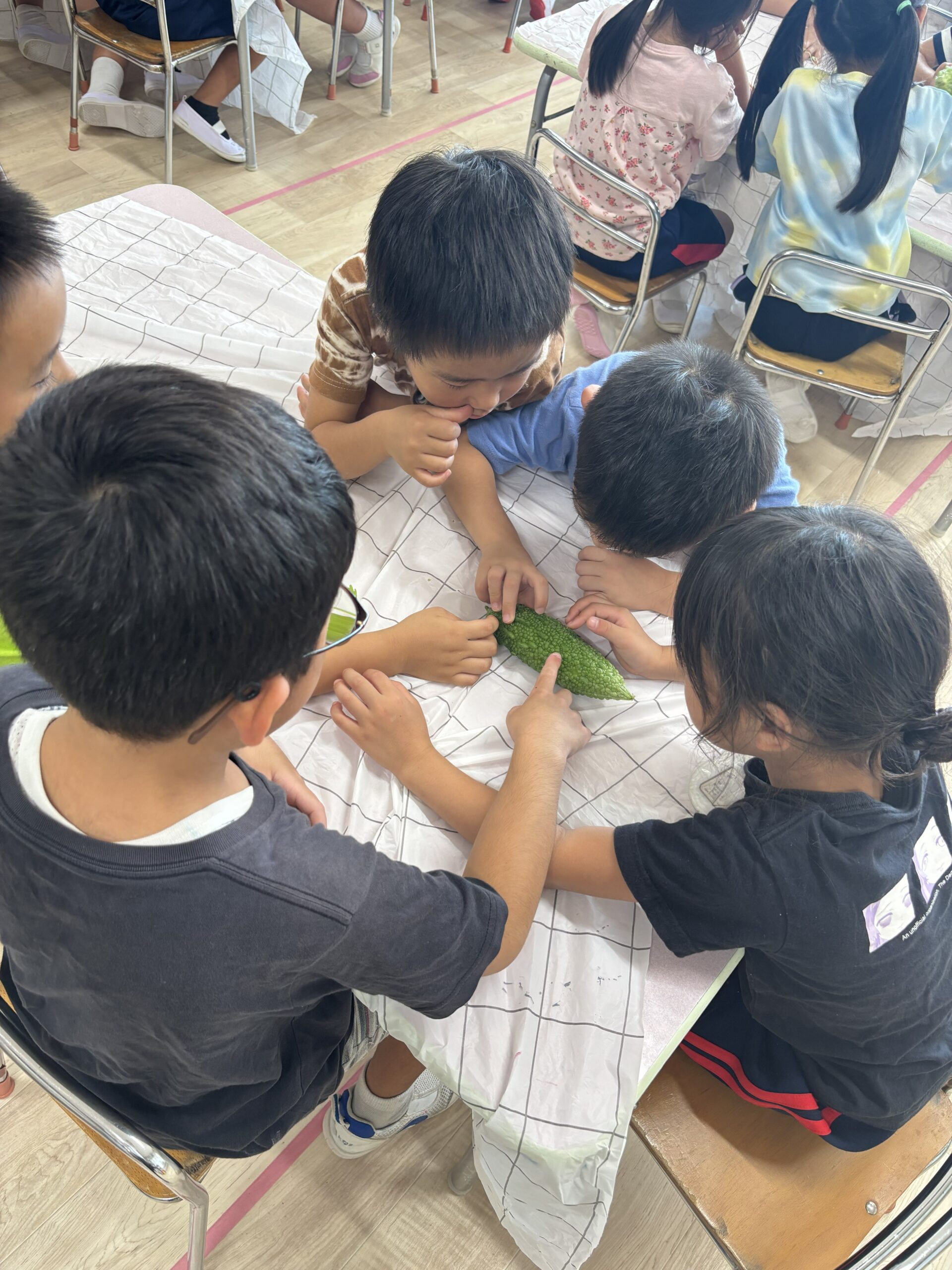 また、雄花と雌花の違いを伝え、観察したり人工授粉に挑戦したりすることができました。大きく育ったゴーヤの収穫では、匂いを嗅いだり大きさを比べたりしながら、生長の様子を楽しんでいました。