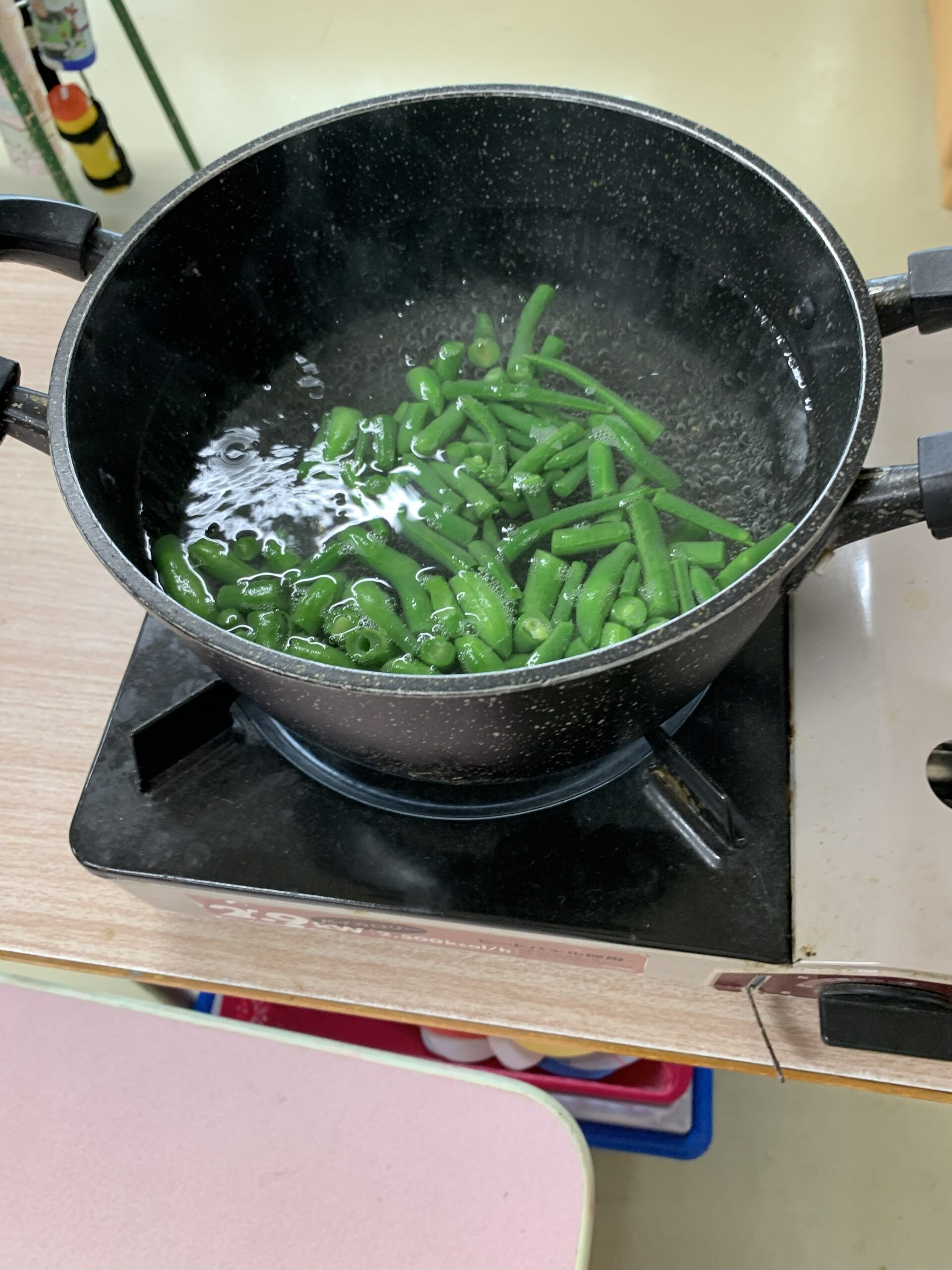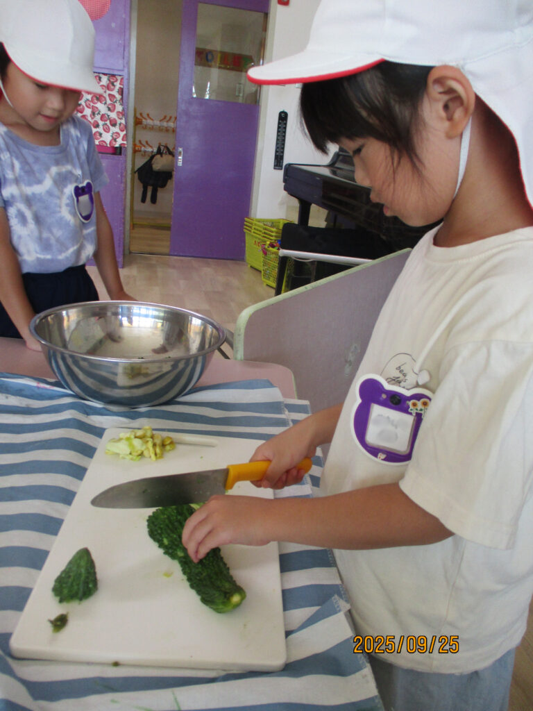 また、収穫したゴーヤをどのように食べるかについて話し合い、「ゴーヤの漬物」と「ゴーヤのチーズ焼き」に決まりました。さらに、「ゴーヤのタネやワタを使った卵焼き」も作り、ゴーヤを余すところなく食べることができることを、体験しました。