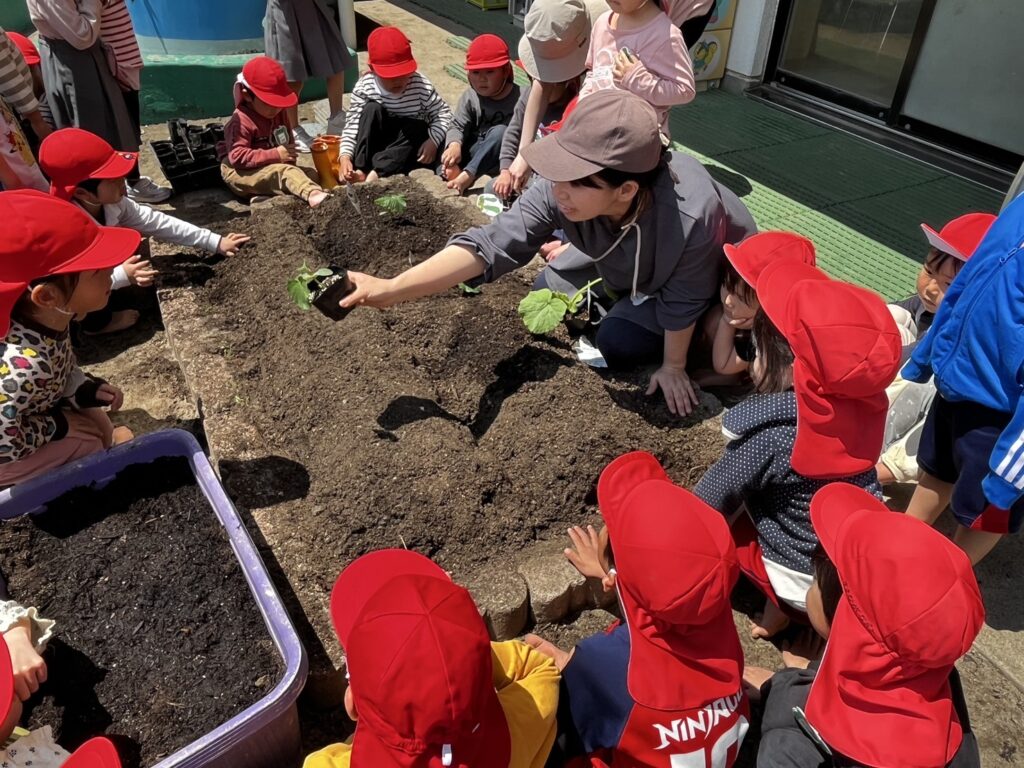 年少・年中組の子どもたちも、年長さんの姿を見て、「自分たちにも何かできることはないか」と考え、「ツルが伸びる野菜」を育てることにしました。苗植えの際には、ポットから取り出した苗の根っこの多さに驚く子どもたち。きゅうり、かぼちゃ、つるむらさき、おかわかめなどを、1階でも育て始めました。