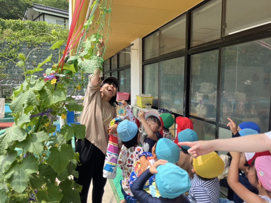 夏の日差しがとても強く、1階の野菜は思うように育たないこともありましたが、きゅうりとつるむらさきは暑さに強く、どんどんツルを伸ばしていきました。ツルが横にも広がっていく様子に、子どもたちは「こんなところまで伸びた!」と驚き、その生長の力強さを感じていました。