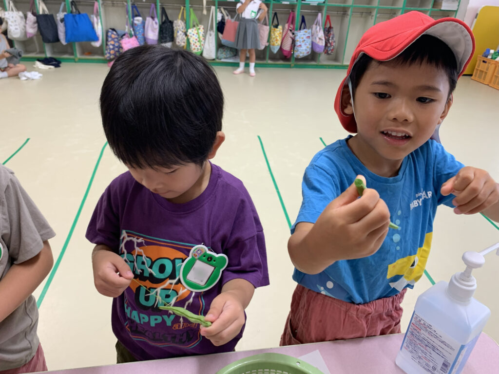 きゅうりの収穫ではチクチクとした刺激を感じながら慎重に触れたり、つるむらさきでは「どの部分が食べられるのかな?」と考えたり、「ネバネバするんだね」と粘り気に気づいたりと、普段食べ慣れない野菜にも関心を持って触れる姿が見られました。いんげんのすじ取りもどんどん上達。楽しみながら育てる活動を通して、さまざまな体験を重ねることができました。秋になって枯れたゴーヤの葉は、畑にすき込んで、土づくりに活かします。