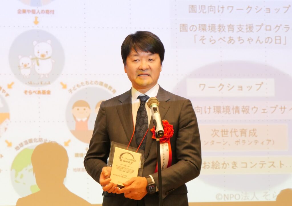 「この度は大変名誉ある賞をいただきましてありがとうございます。そらべあ基金は、ホッキョクグマの兄弟をシンボルに活動するNPO法人です。この兄弟は、地球温暖化の影響で北極の氷が溶けてしまい、母グマと離ればなれになってしまい涙をながしている、というストーリーを持っています。我々はこの地球温暖化を防ぐための活動として、協賛社からのご協力をいただき、幼稚園や保育園に太陽光発電設備を寄贈するという活動を、2008年の設立以来、続けてまいりました。本年、ようやく100基に到達するという記念すべき年に、このような名誉ある賞をいただき、大変光栄に思っております。どうもありがとうございました。」