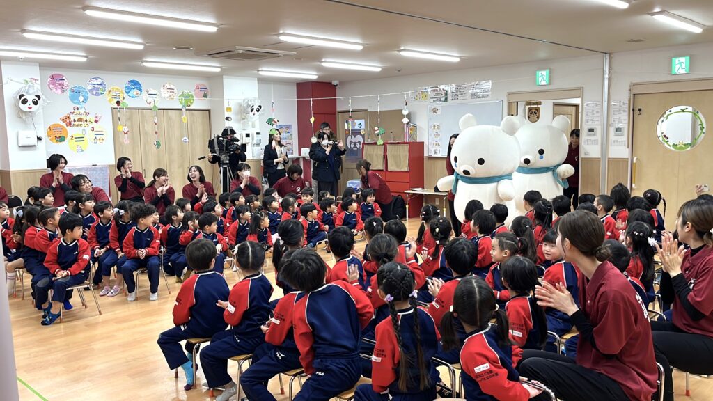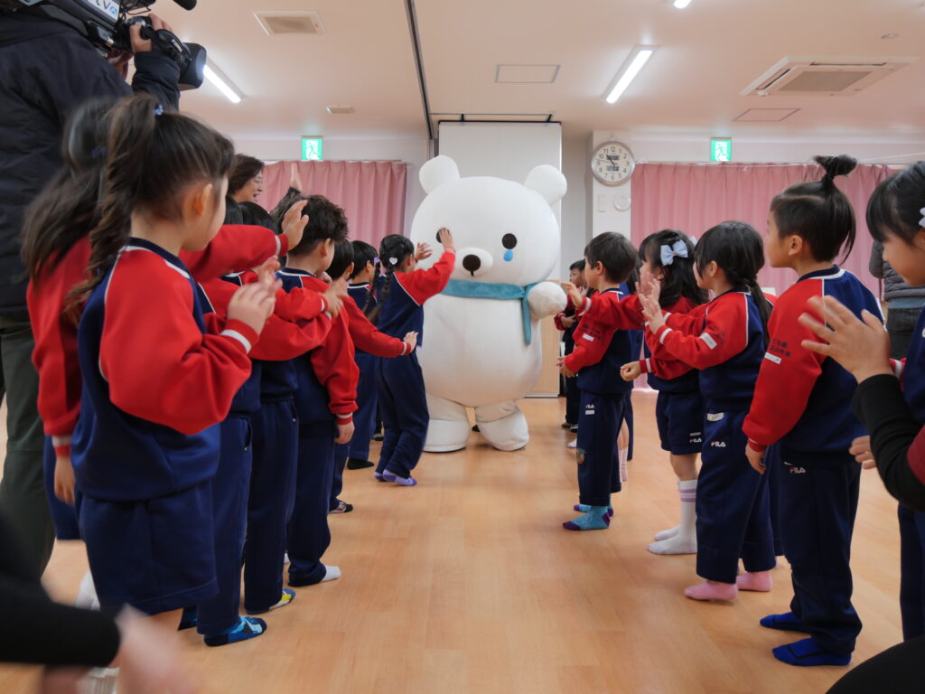 式典は3歳児・4歳児・5歳児の計83名の園児さんと先生方、協賛のソニー生命の皆さま、そして、メディアの方々をお迎えし、賑やかに行われました。司会の天野先生の合図にあわせて、みんなで「そら~!、べあ~!」と大きな声で呼ぶと、それに応えて「そら」と「べあ」が登場。子ども達は拍手と歓声をあげて大歓迎してくれました。