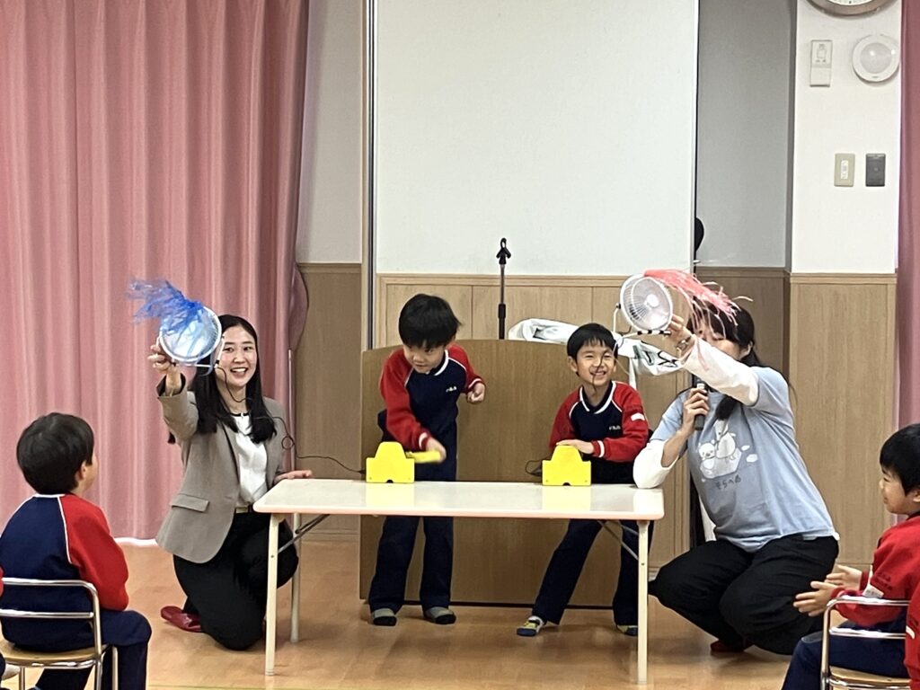 続いて、電気は色々な方法で作れることを体感してもらうために、園児代表の4名に手回し発電実験に挑戦してもらいました。みんな頑張ってハンドルを回し、自分が作った電気で扇風機を回すことができました。実験大成功!でも、終わった瞬間に「ふぅ~!」とちょっと疲れた様子の子も。お手伝いいただいたソニー生命の住吉さんから園児さんにインタビューしてもらうと「楽しかった!」「ちょっと大変だった」という感想を教えてくれました。