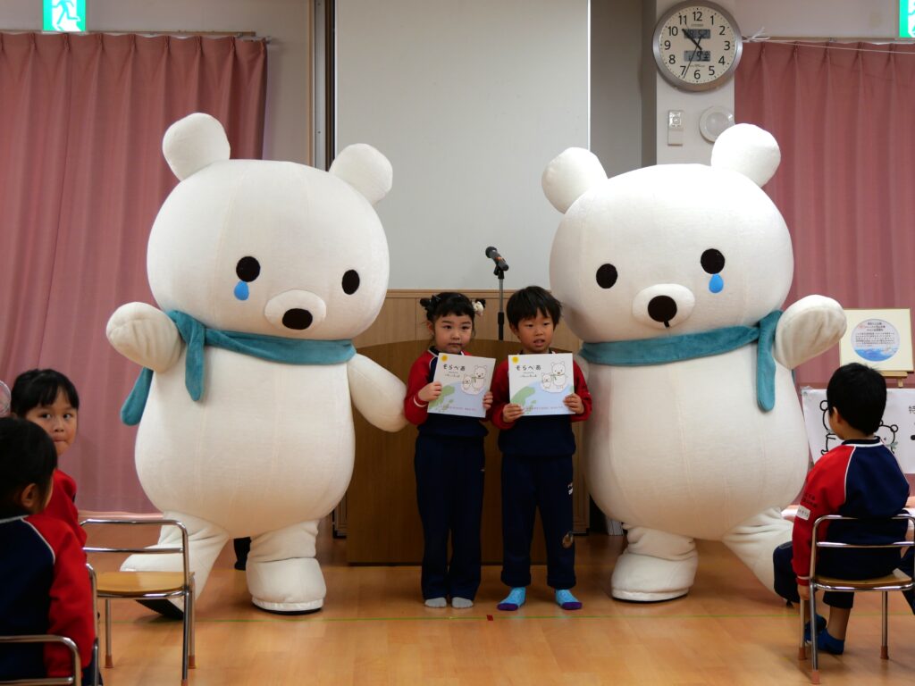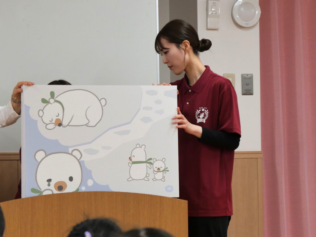 まず、北極の氷が溶けてお母さんと離ればなれになってしまい泣いている「そらべあ物語」を紙芝居で読んでもらいました。