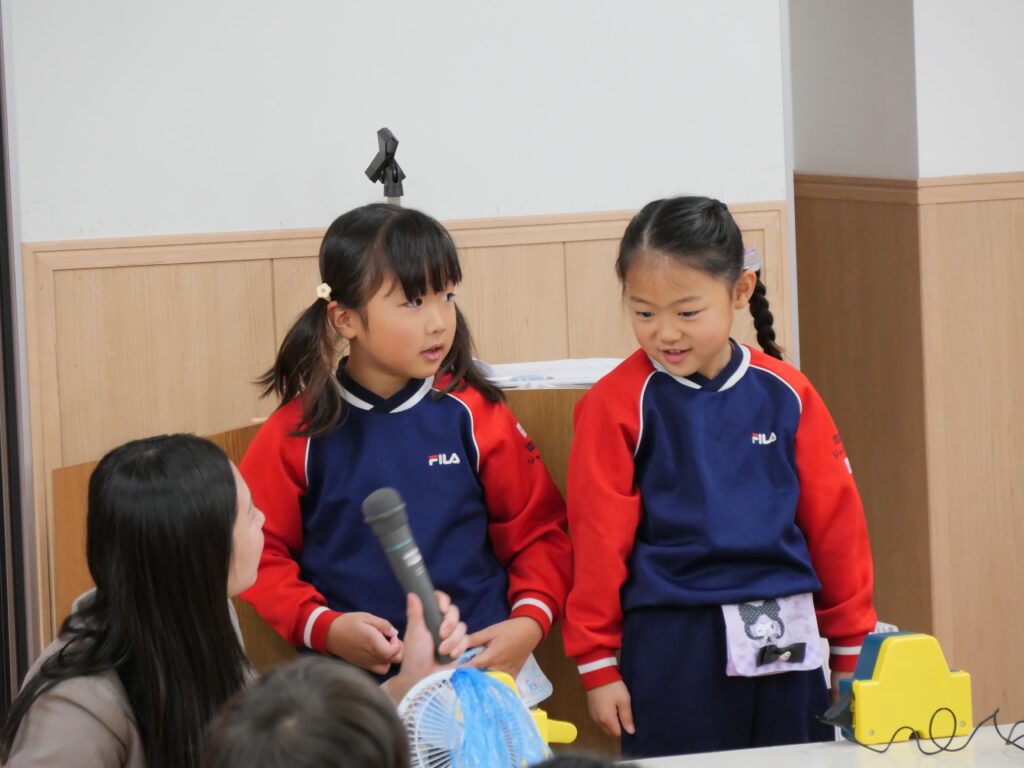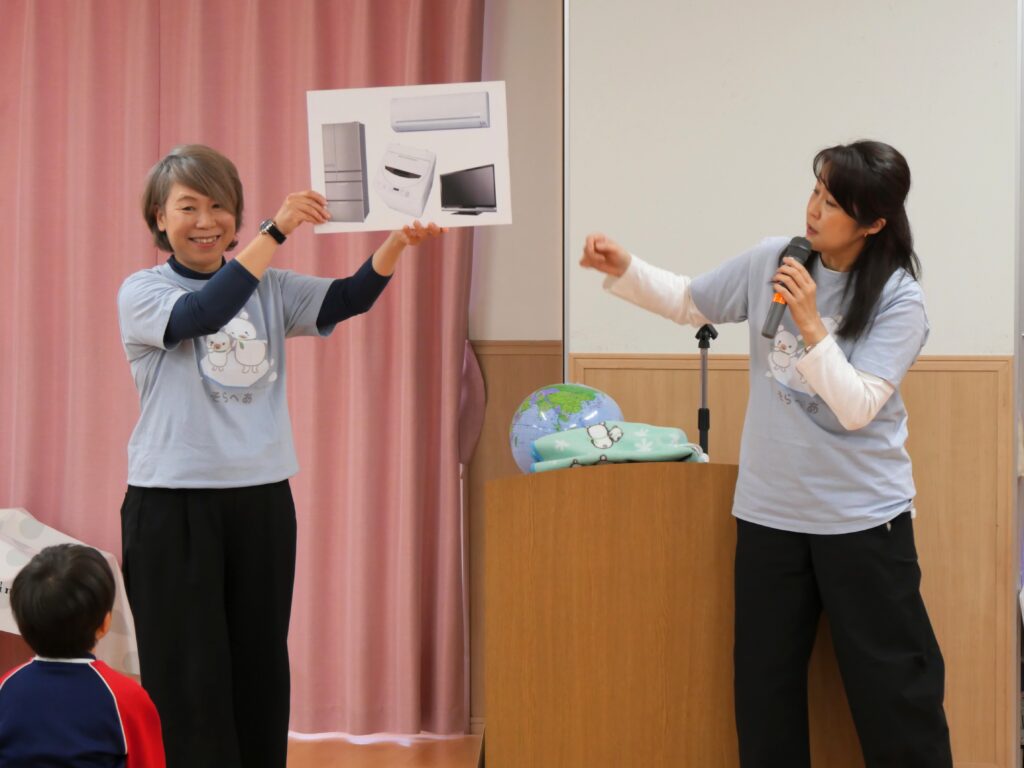 その後、当基金スタッフからどうして「地球温暖化」が起きているのかを説明し、子どもにもできることがあるのかなど、クイズやお話で伝えました。