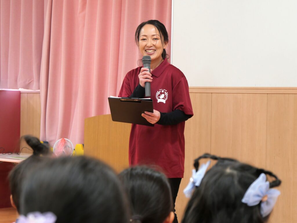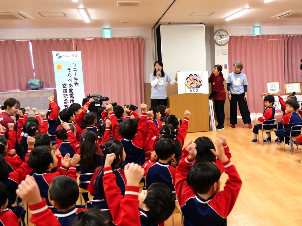 「太陽はとても大切で、色々な植物が育つ時に必要なものです。みんなの園の名前にある「ジャックと豆の木」のお話にも出てくる豆が大きくなる時にも太陽が必要です。この太陽が電気を作ってくれる「そらべあ発電所」を第二園舎の屋上にプレゼントしたので、大事に使ってください。そして、これから発電日記などの活動が始まると思いますので、頑張って取り組んでみてください。」