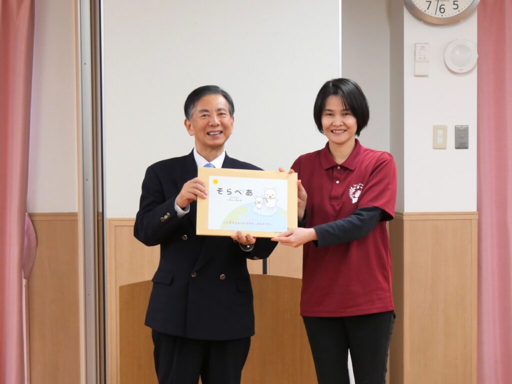 ソニー生命 松山支社 支社長の宮長様から、寄贈のお祝いとともに、子ども達へ「みんなができることはいっぱいあります。みんなが頑張ることでそら君、べあ君がお母さんに会える日が近づくので、頑張りましょう」とご挨拶をいただきました。