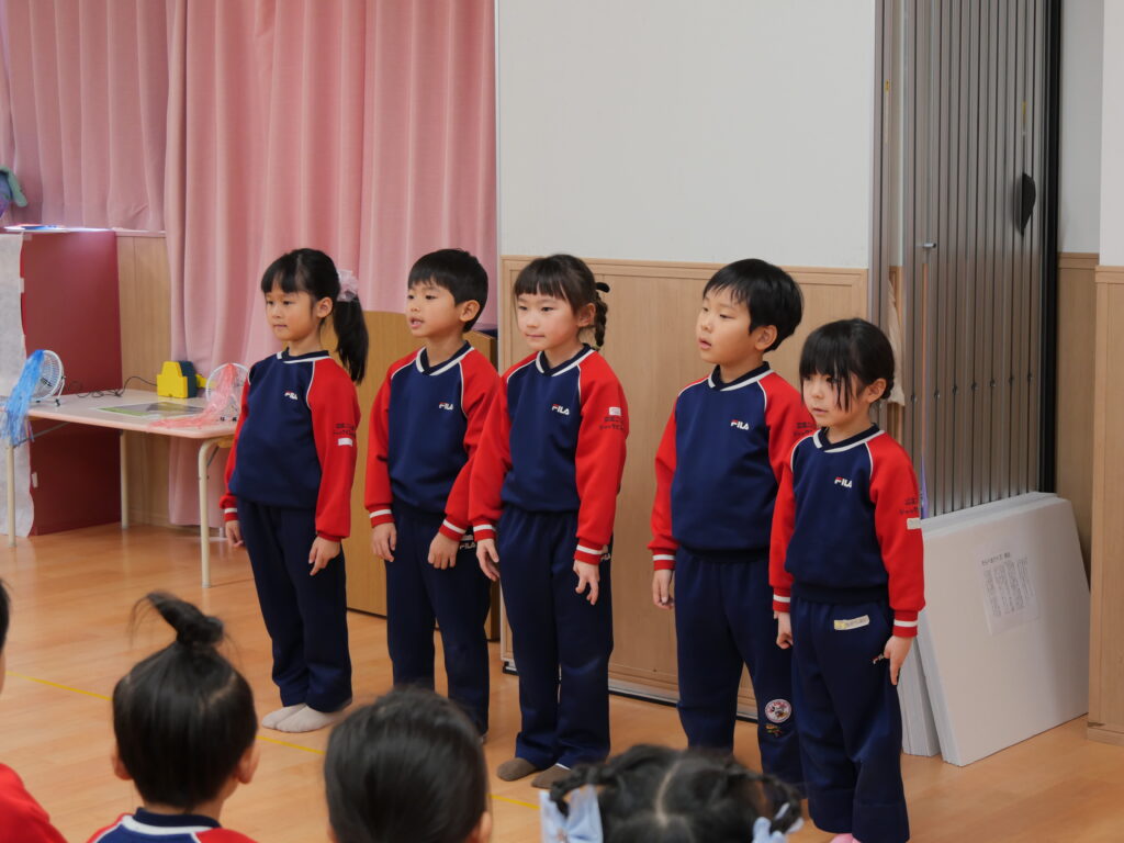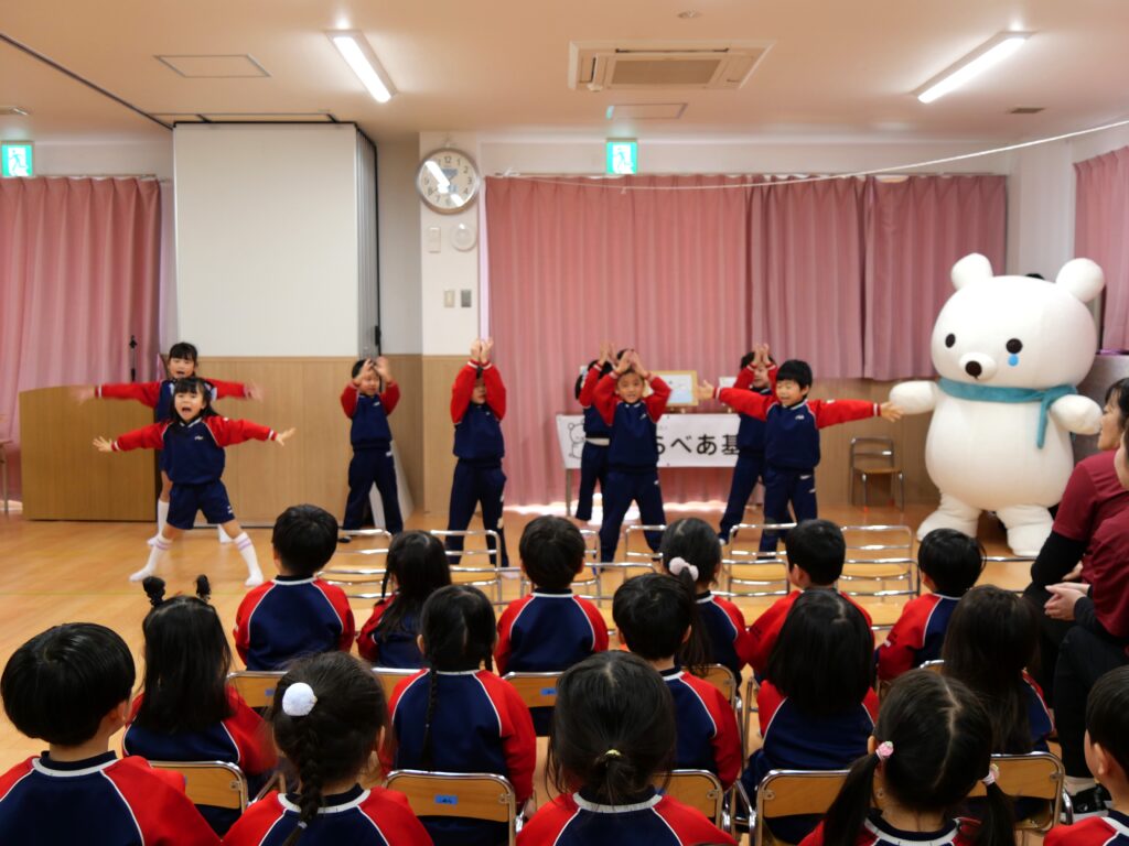 年長児さん全員による元気いっぱいのソーラン節の踊りの披露と、年長児5人から「お礼」と「大切に使っていくこと」を、大きな声で強く発表していただきました。そらべあ達もとても心強い気持ちになったと思います。