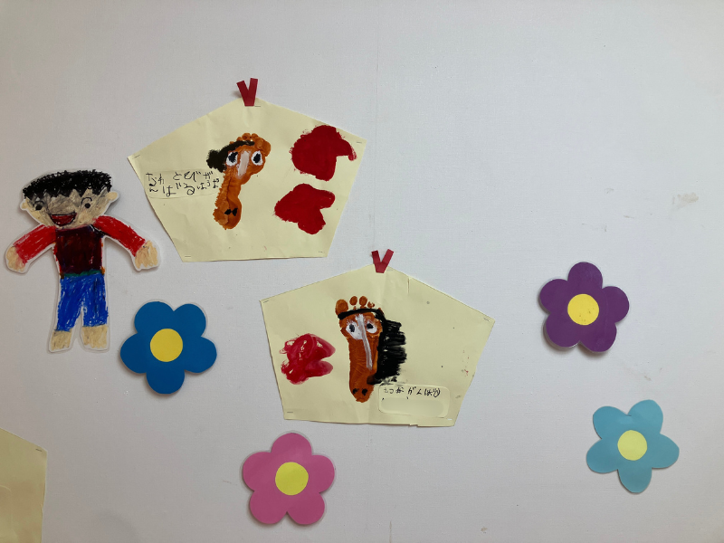 新年を迎えたばかりの園の階段には、「頑張りたいこと」が書かれた絵馬が壁に飾られていました。2026年の干支である馬は、園児さんの足形で描いたそうです。どれも個性的なお馬さん。一年間、お馬さんのように走り抜けてそれぞれの「頑張りたいこと」に邁進していってほしいと思います。